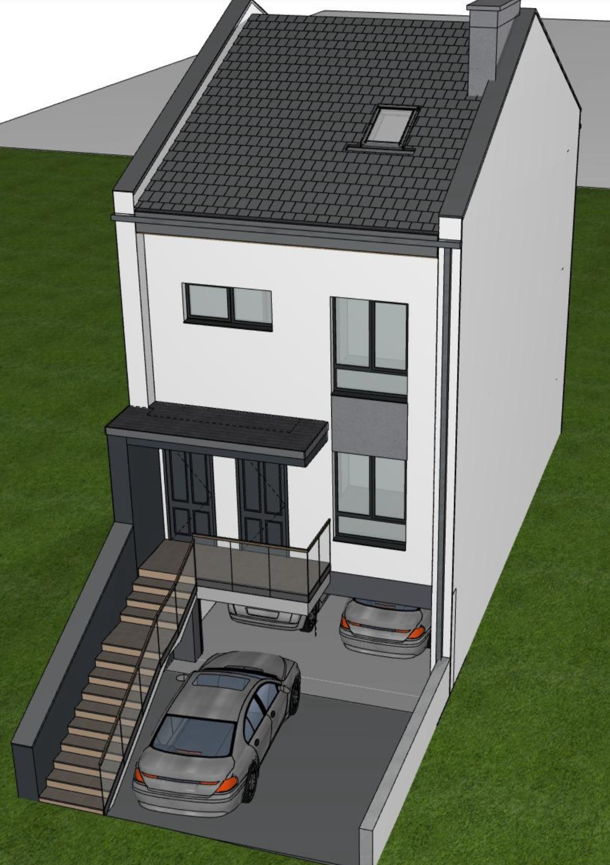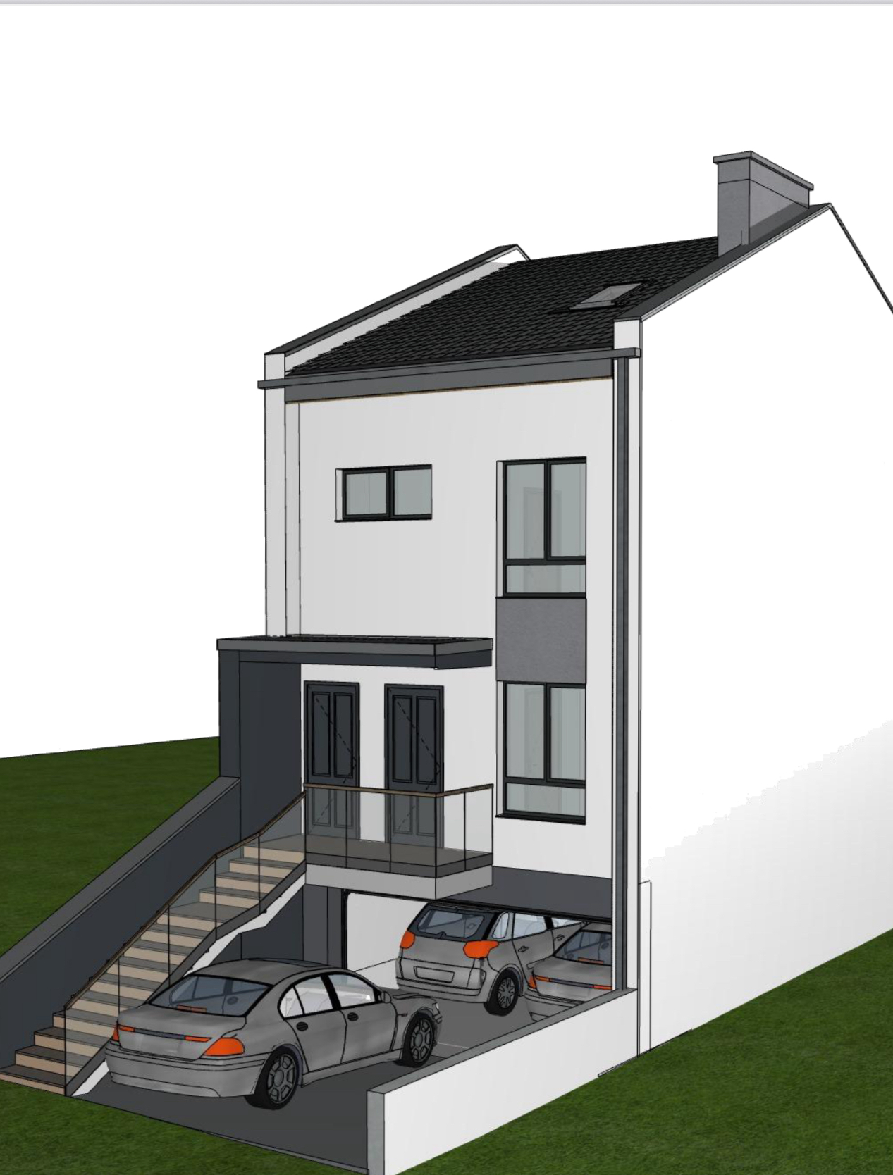 Kondygnacja I (przyziemie) zawiera halę garażową na 4 auta (po dwa na każde mieszkanie).